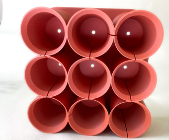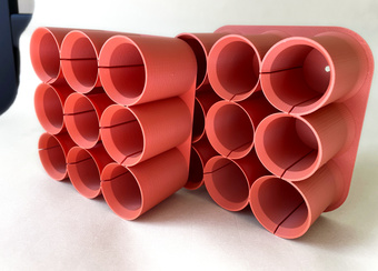 These two are printed in terracotta PLA. Just FYI - PLA isn't great with heat, so these aren't for autoclaving or running under hot water. For room-temp bench work and storage though, they're fine! Non-reactive with standard things like ethanol.