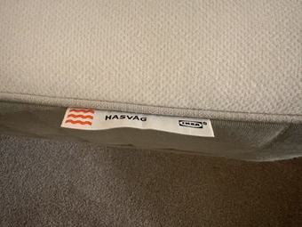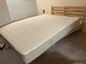Selling an IKEA queen-size bed frame with two HASVÅG mattresses.