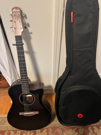 Hey! I'm heading back to Germany from Stanford and need to sell my guitar. It's an Ibanez AAM70CE Advanced Auditorium acoustic-electric western guitar in Transparent Charcoal Burst, only about 6 months old. It's a good middle-class guitar that originally costs around $550 with everything included. Comes with a guitar bag, picks, and a capo. Selling everything for $200.