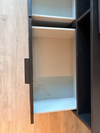 IKEA BRIMNES TV unit with three drawers and three shelves (https://www.ikea.com/us/en/p/brimnes-tv-unit-black-40569486/). Some damage to inside of one shelf (pictured). Dimensions are 180x41x53 cm (LxWxH). TV, sound bar, and console NOT INCLUDED.