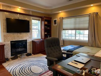 The beautiful downstairs bedroom in our modern Palo Alto home is available starting now - April 1st. The room has plenty of natural light, hardwood floor, wooden built-in closets and a gas fireplace.