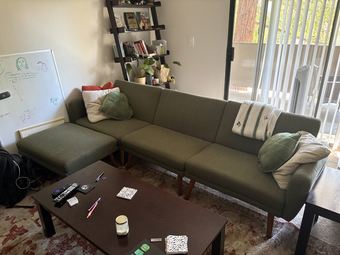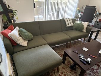 9ft long green couch and ottoman. Very comfortable, and folds down (which is really nice for guests). It disassembles into pieces which makes it pretty easy to move. Blankets/pillows not included. I want to move it within the next month, but I'm flexible on exact dates.