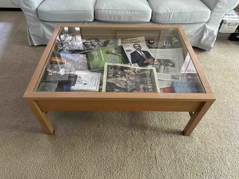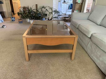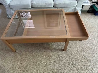 We are moving back to Europe, therefore we are selling our beloved unique and functional glass-top coffee table with built-in display area and side drawer for extra storage.