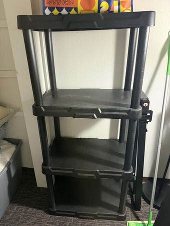 Black shelf: collapsible. Bought for $25. Dimensions: 14x21x49